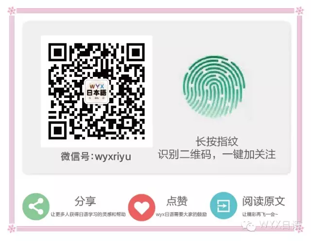 WYX日语微信公众平台每天为大家推送日语学习、日语考试、日本文化、日本动漫、日本留学・观光、日企文化等相关信息,注重语言的实用性和趣味性,提高日语爱好者的日语能力,全方位多方面帮助大家掌握日语语言,了解日本文化。